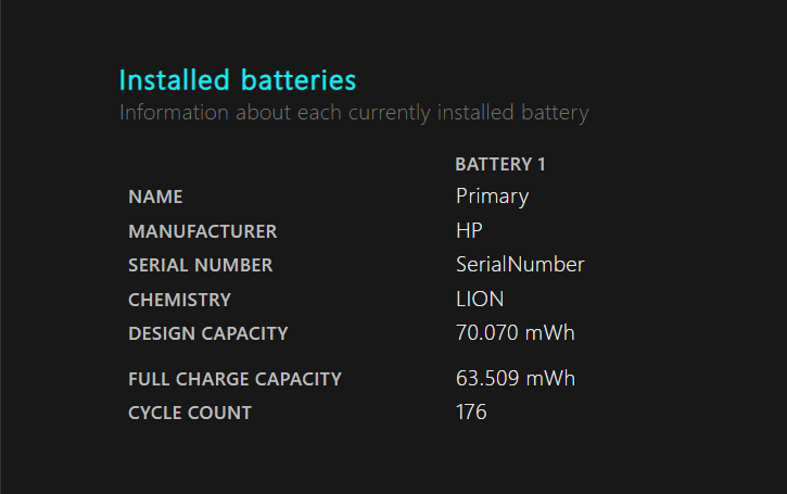 Design Capacity: This is what my battery had when it was brand new (70,070 mWh).